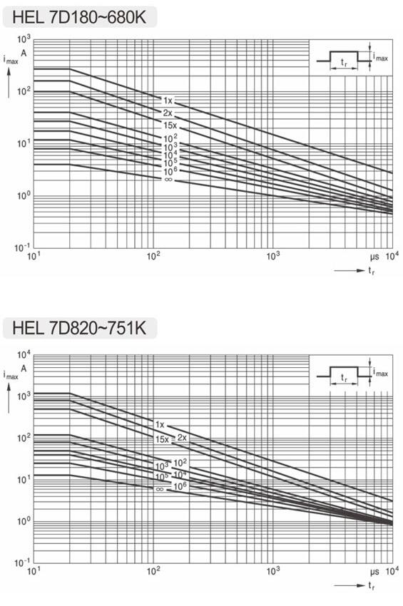 14D满足20D的 脉冲性能要求 14D instead of 20D 举例2 Example HEL14D561KX能达到 6KV/3KA 100次 HEL14D561KX reach 6KV/3KA 100 times |